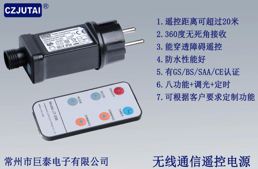 巨泰美規(guī)紅外遙控一體式變壓器,內(nèi)置多功能控制(八功能、定時(shí)、調(diào)光、無極雙色泡控制、RGB控制等功能),插上燈串直接可用,省去焊接獨(dú)立控制器的工序,更加方便您的生產(chǎn)和出貨。